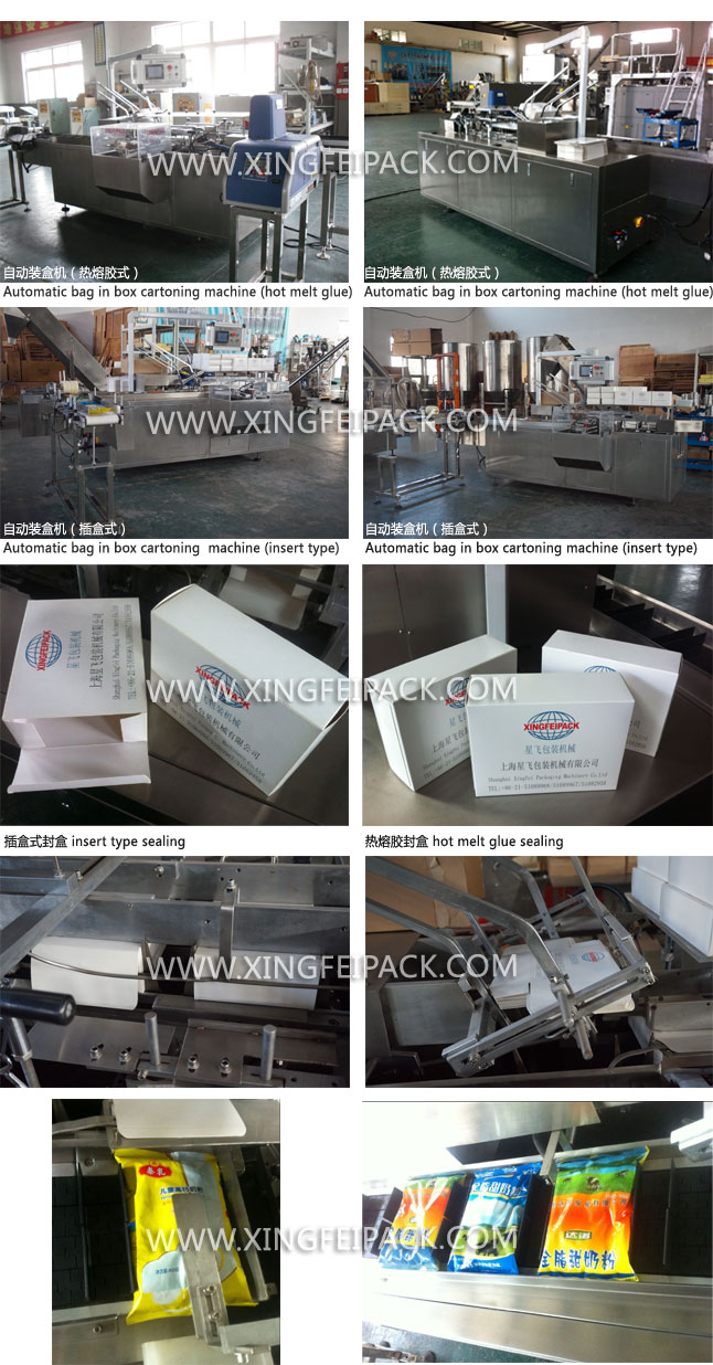 本機適用于袋裝產品的包裝,能自動完成袋子輸送,紙盒供應,打開,袋子裝盒,封盒等工作。有兩種封盒形式可供選擇:插盒,熱熔膠。